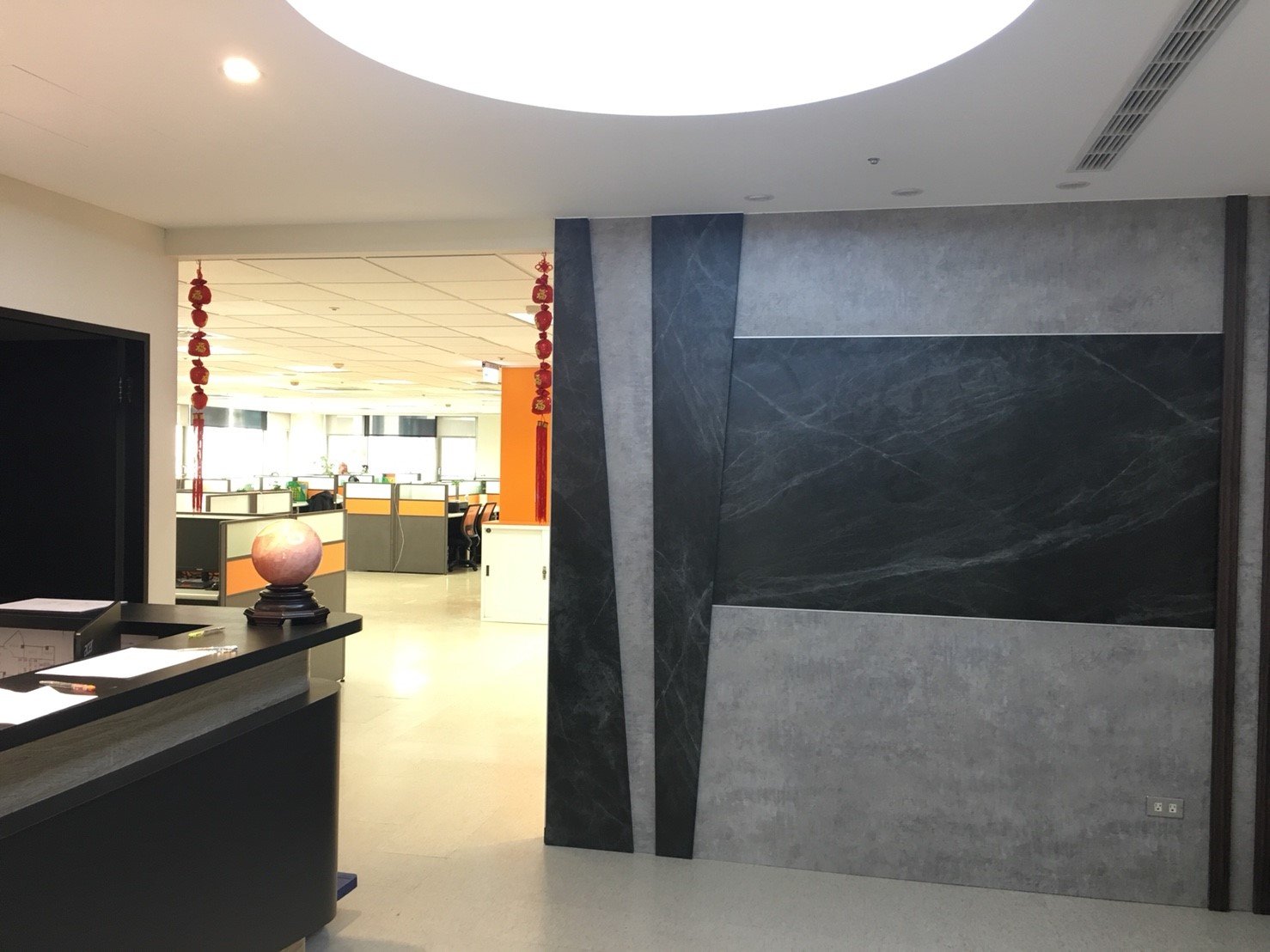 此案例的辦公室裝潢風格以沉穩大方的專業形象為主題,通過迎賓櫃檯區的黑色大理石紋搭配灰色水泥,展現出高貴典雅的氛圍