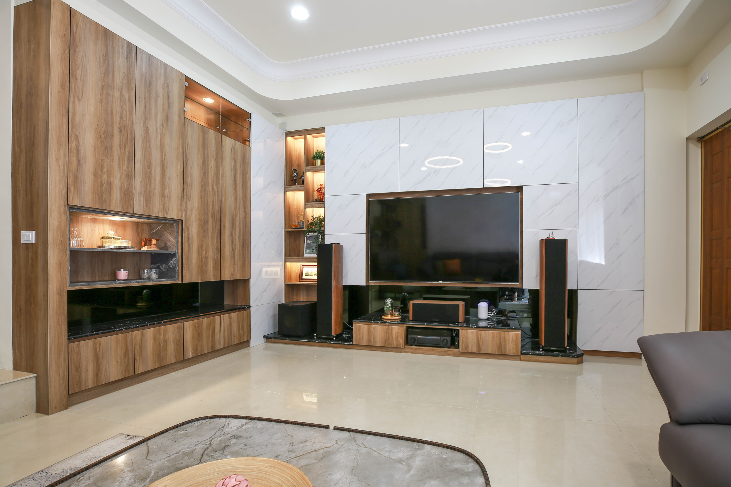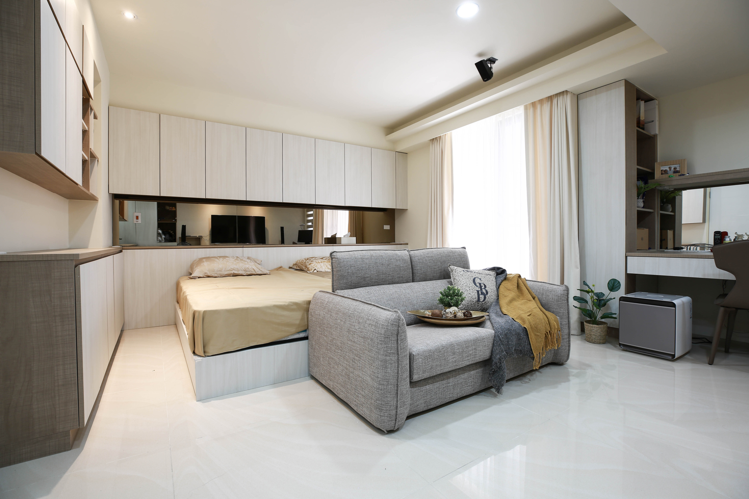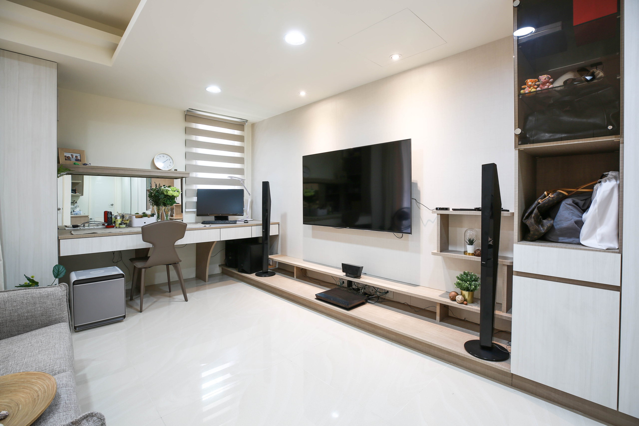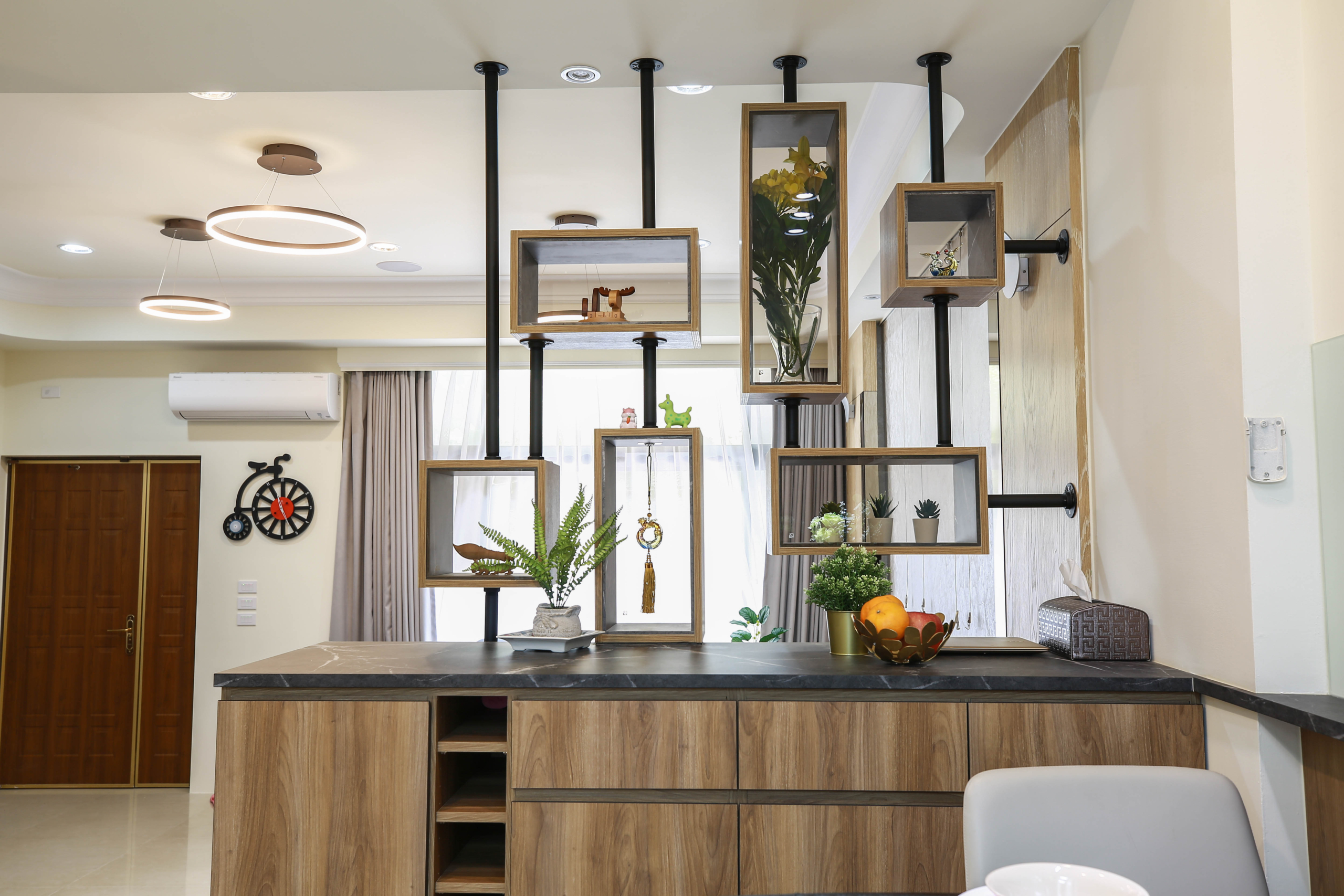 客廳特別設計收納屏風,兼具展櫃及美感設計,提升居家生活質感