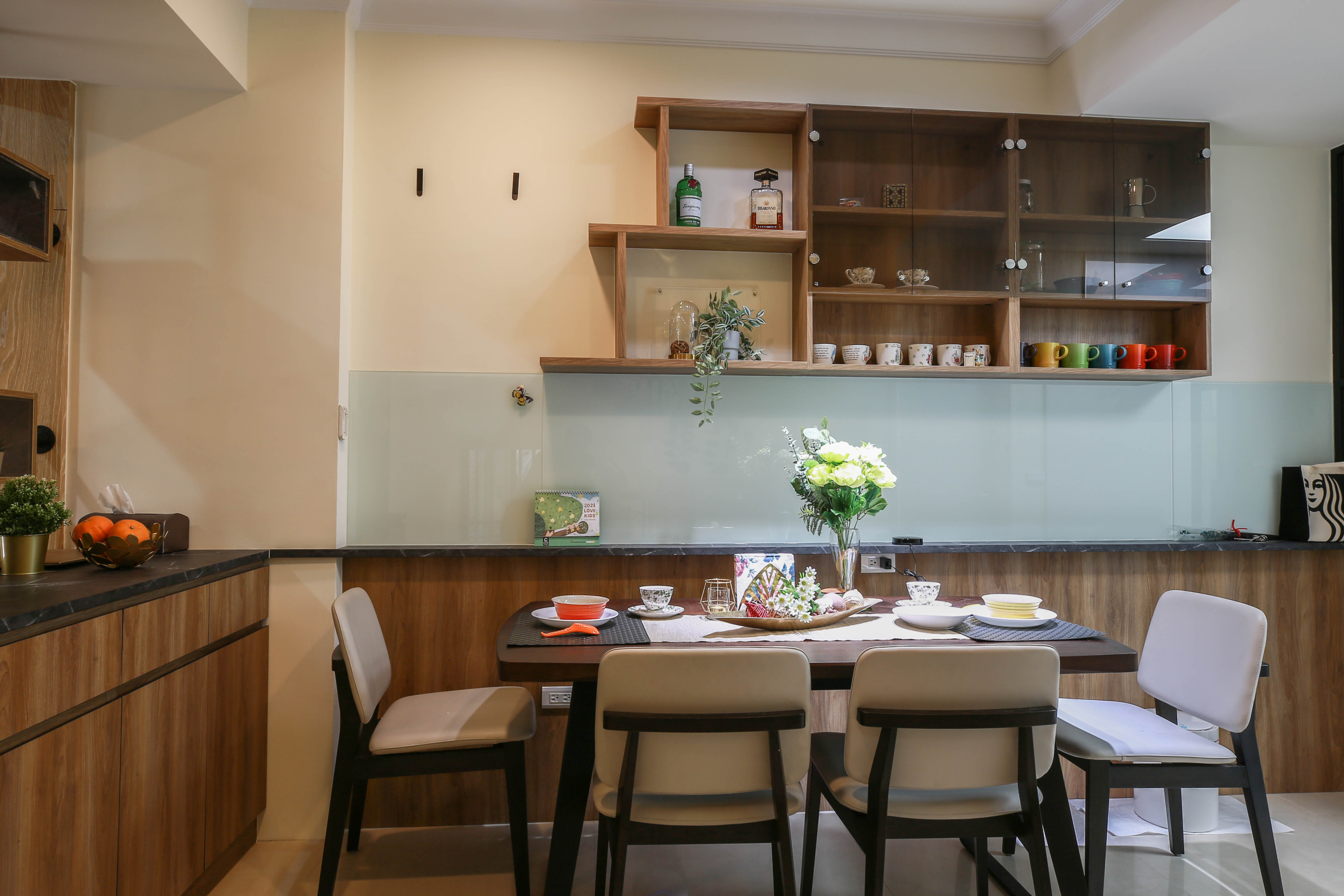 天花以弧線方式設計,讓整體氛圍輕快活潑,櫃體以木紋及石材搭配,與空間形成對比,呈現現代質感