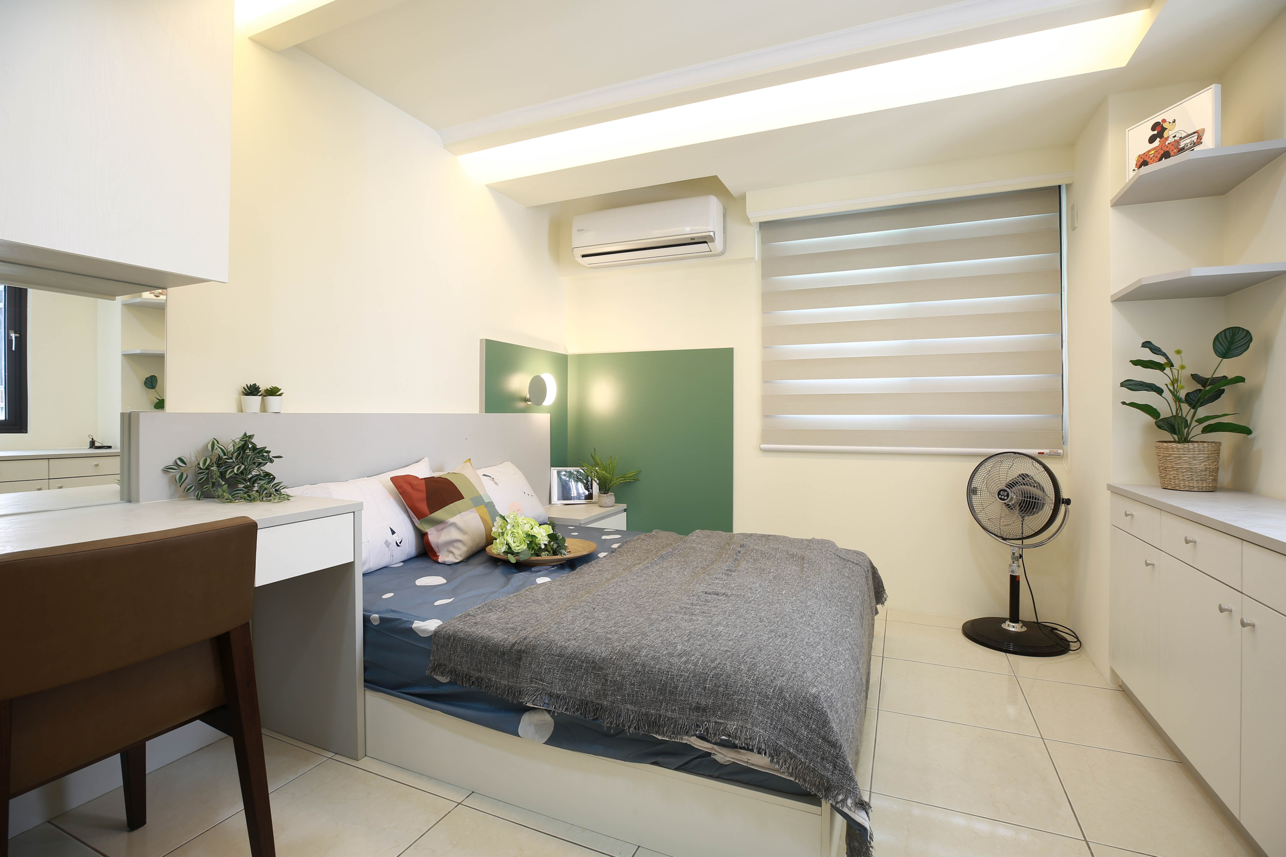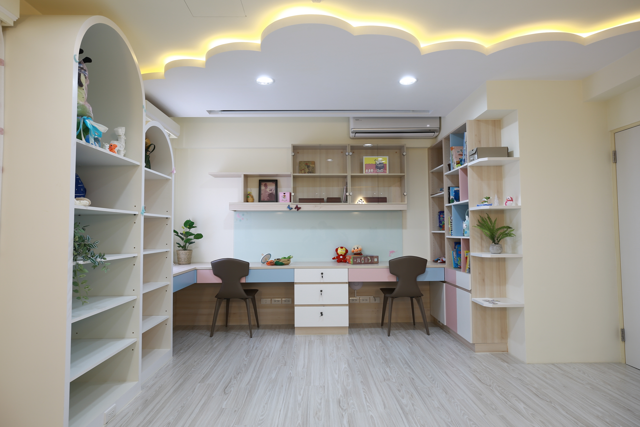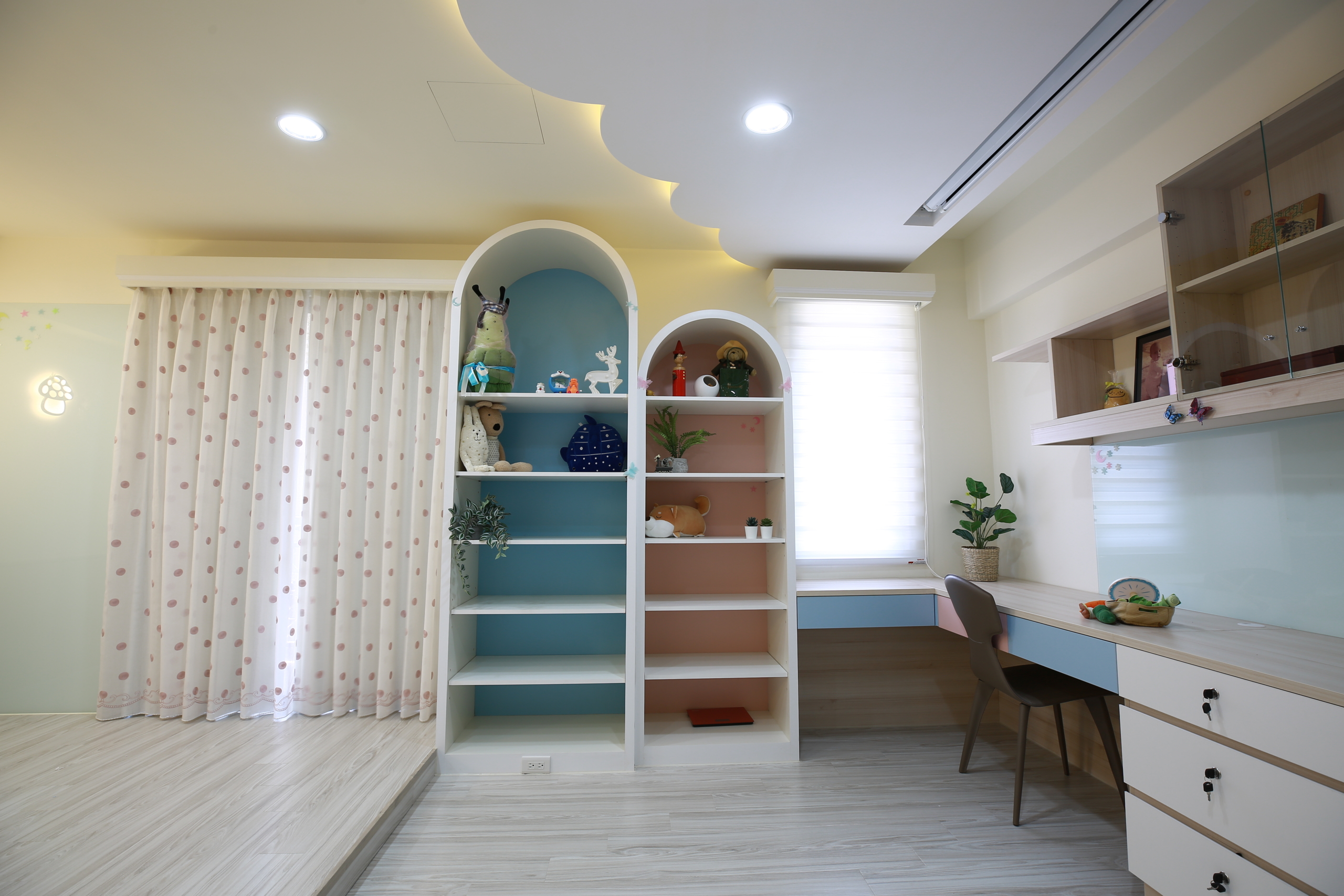兒童房特別設計雲朵造型天花,並搭配弧形櫃體及風格跳色,讓空間活潑又充滿生氣