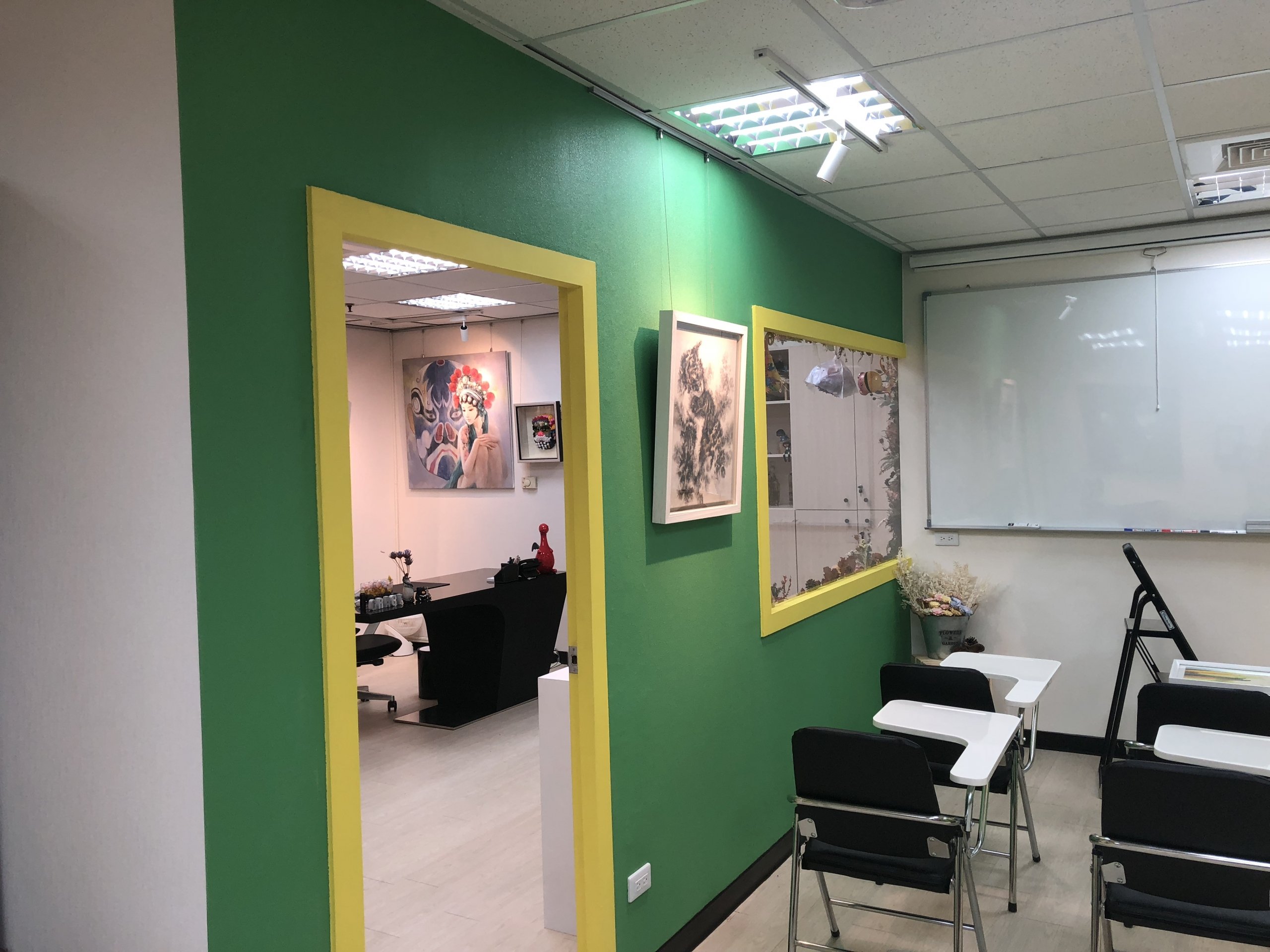 在牆面的設計上,屋主喜愛的綠色被運用到了設計中,成為了這個辦公室的一個重要元素。綠色是一種具有安靜和舒緩作用的顏色,能夠帶來一種自然、和諧